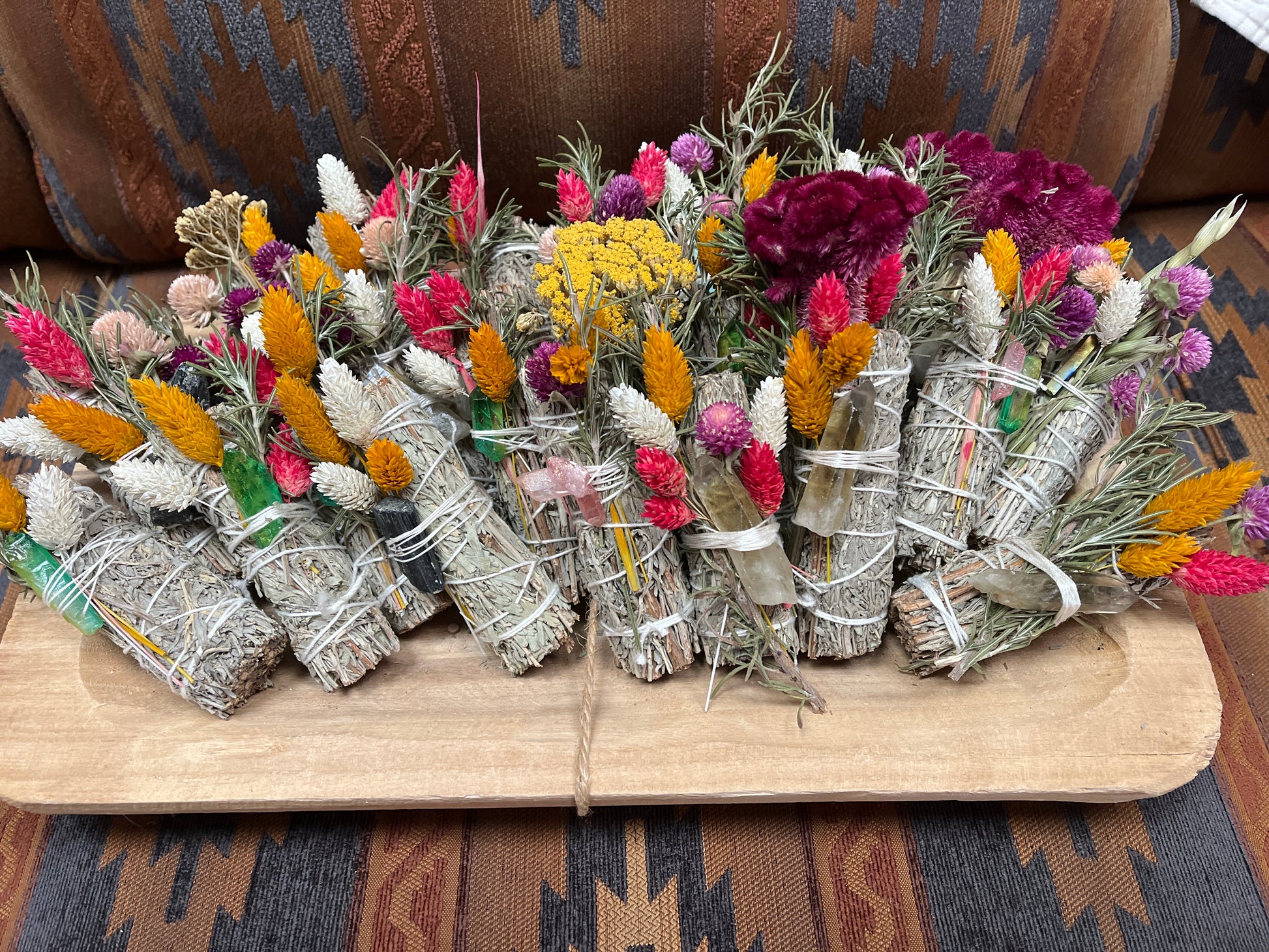 beautiful sage smudge stick with a crystal, dried flowers and a touch of fresh rosemary or lavender. Makes for a nice housewarming gift and perfect for Mother’s Day.