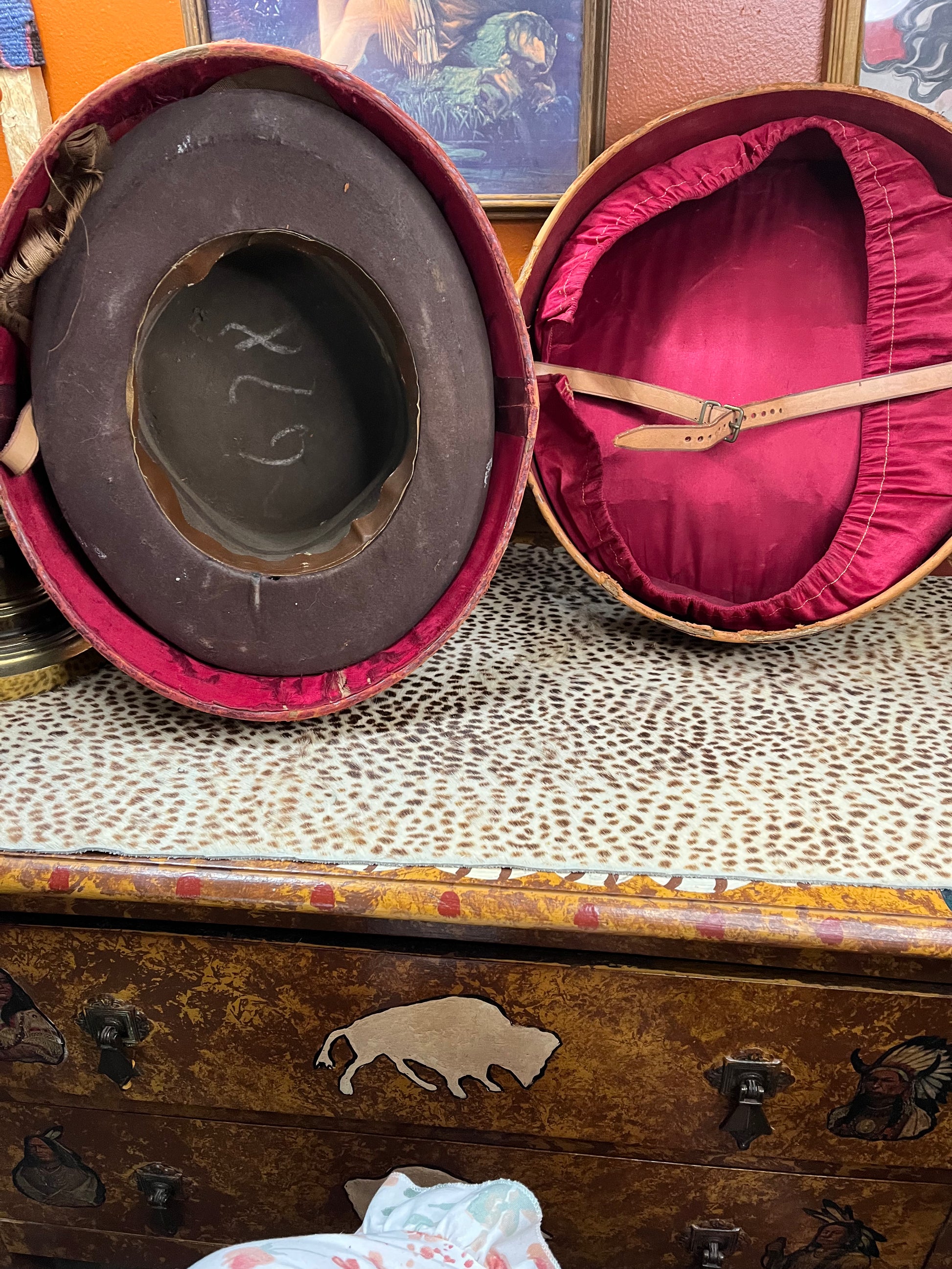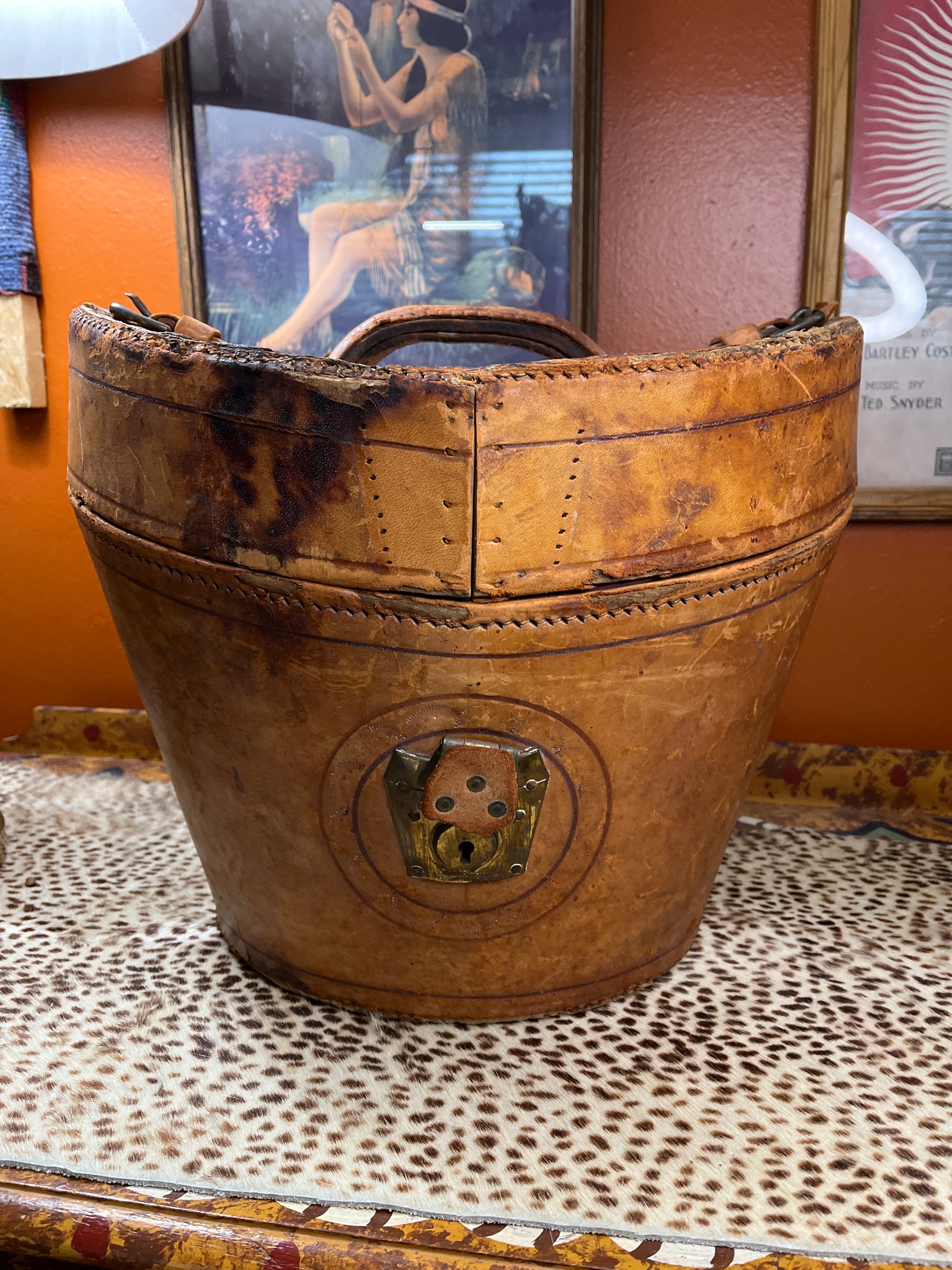 Going for the Ralph Lauren cowboy aesthetic? This is the must have piece!! Antique leather top hat carrier. Even has the original top hat!! This piece has been perfectly weathered and is gorgeous. A real must have. Ralph would be jealous.